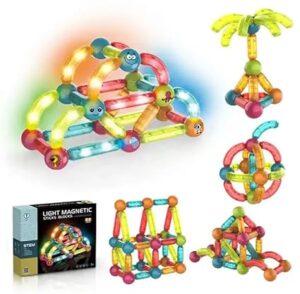 LED 3D Lights Magnetic Tiles Blocks Constructions Building 52Pcs Sticks & Balls STEM Playset for Kids
