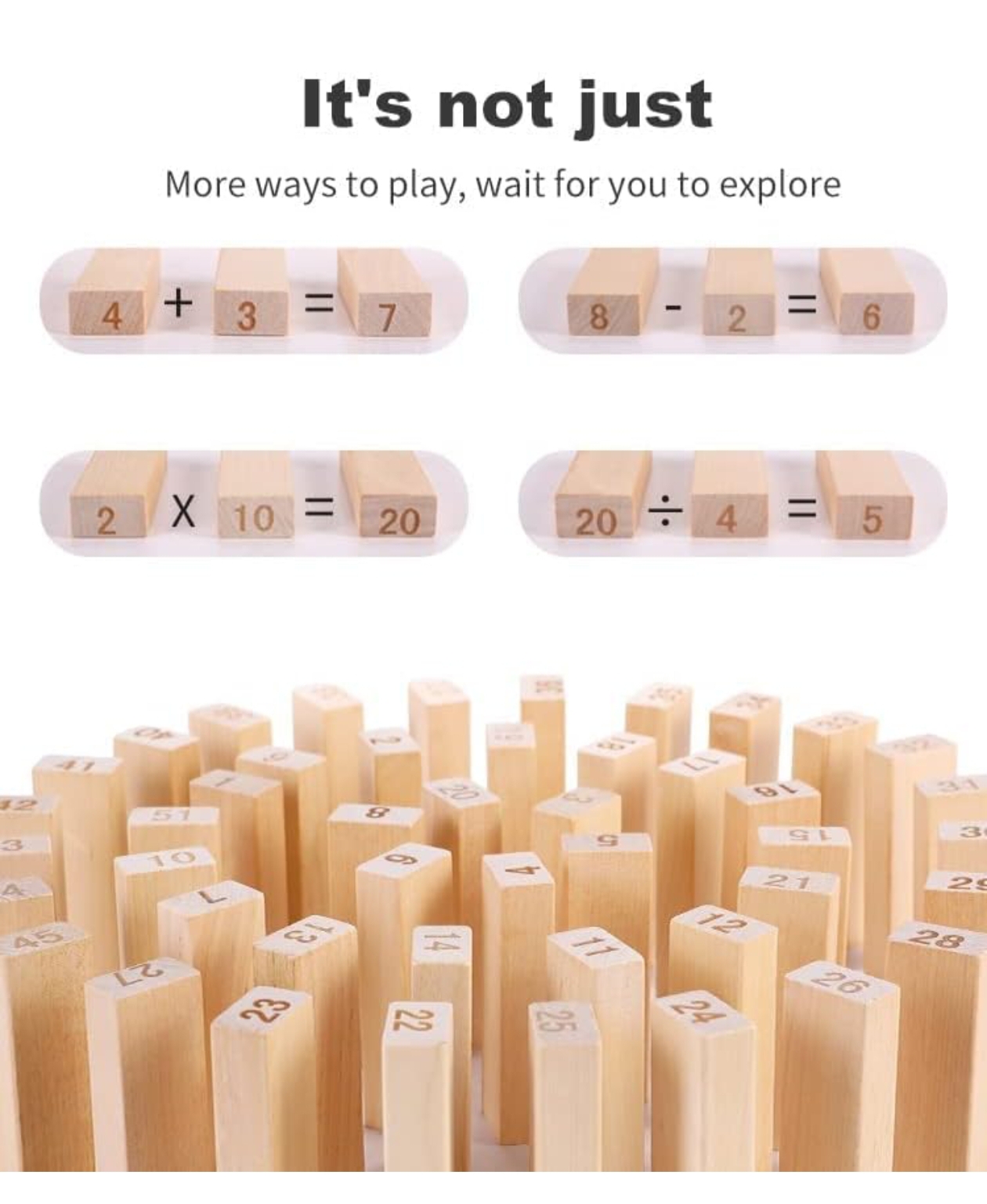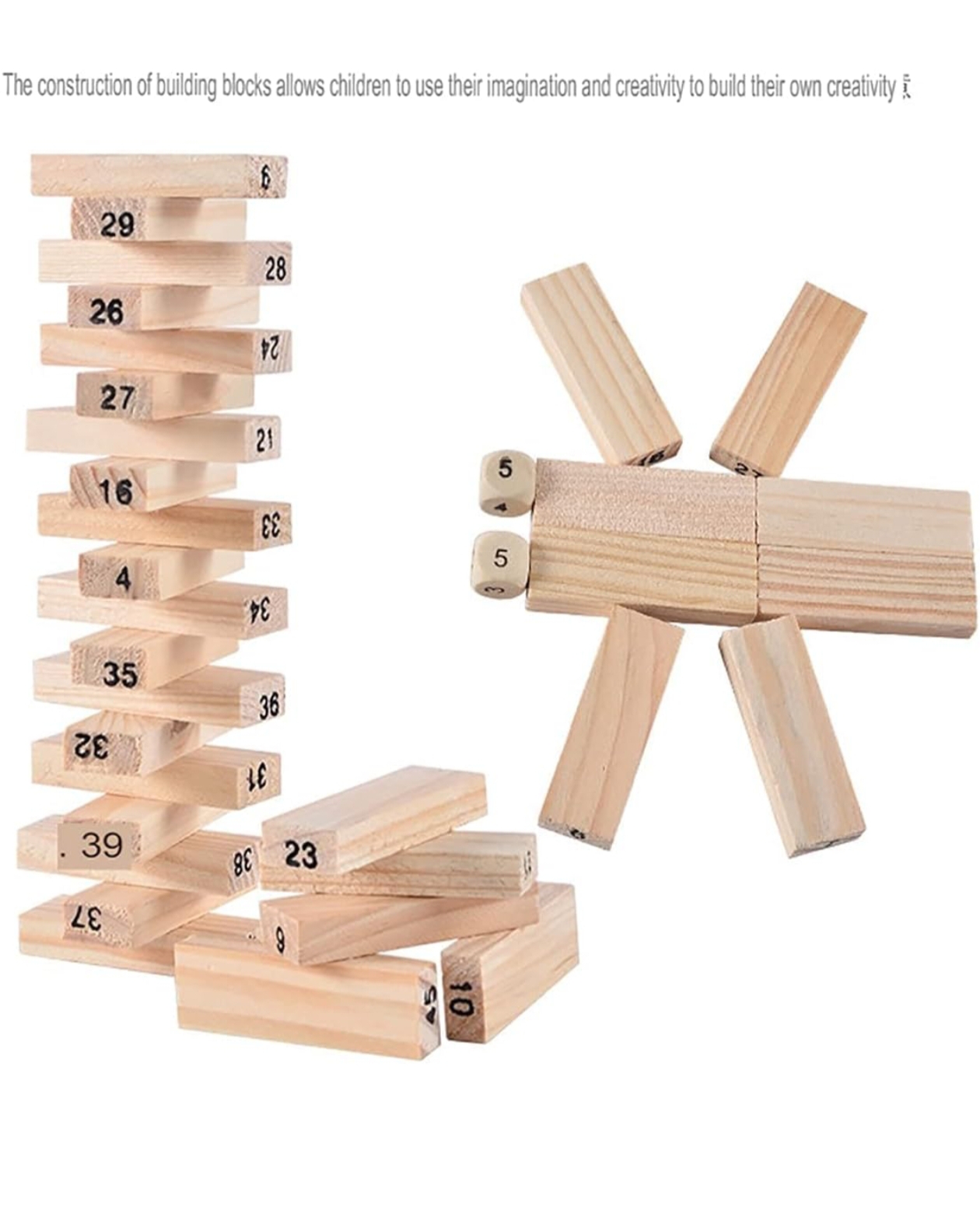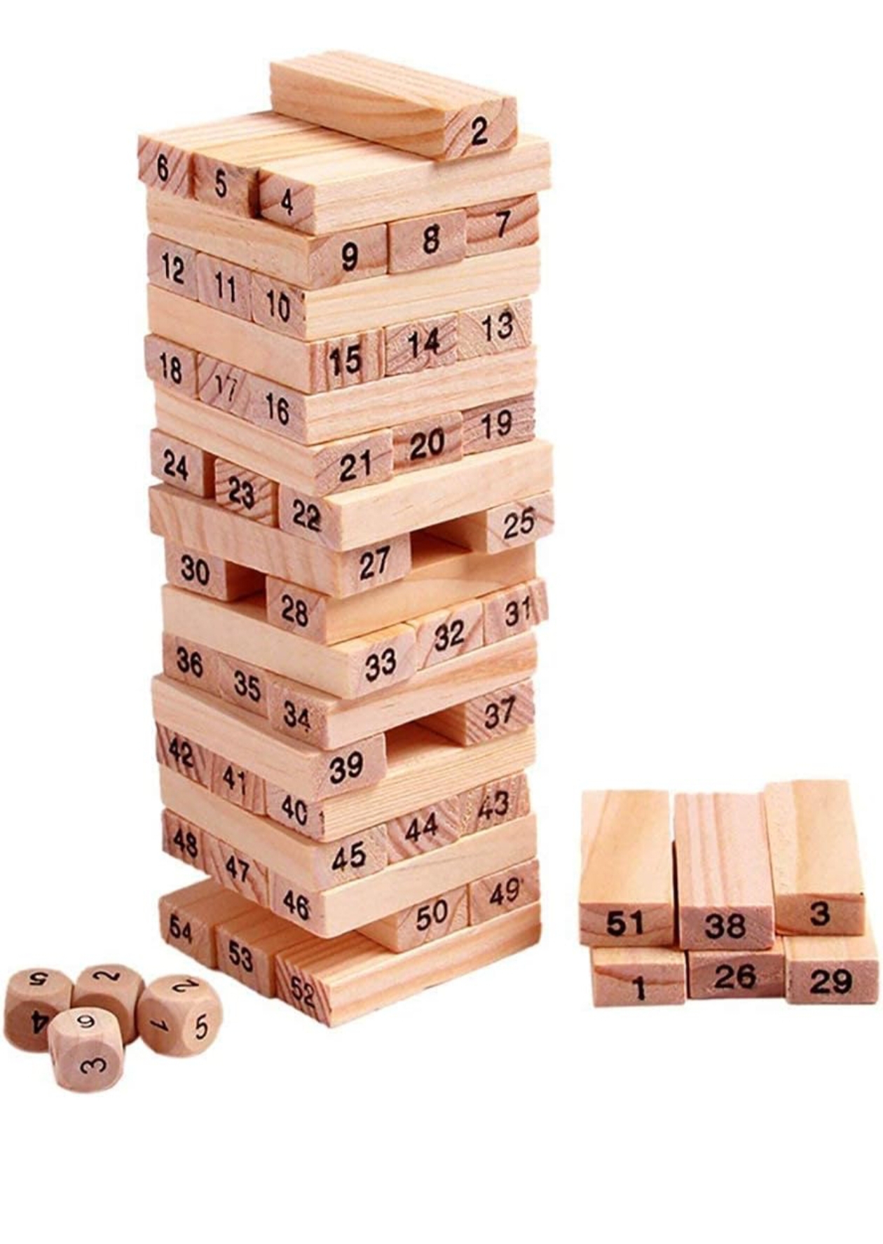 - QUALITY: Contains 54 High quality wooden blocks and 4pcs Dice with smooth edges and plane surface.