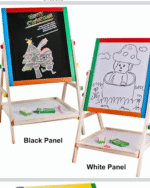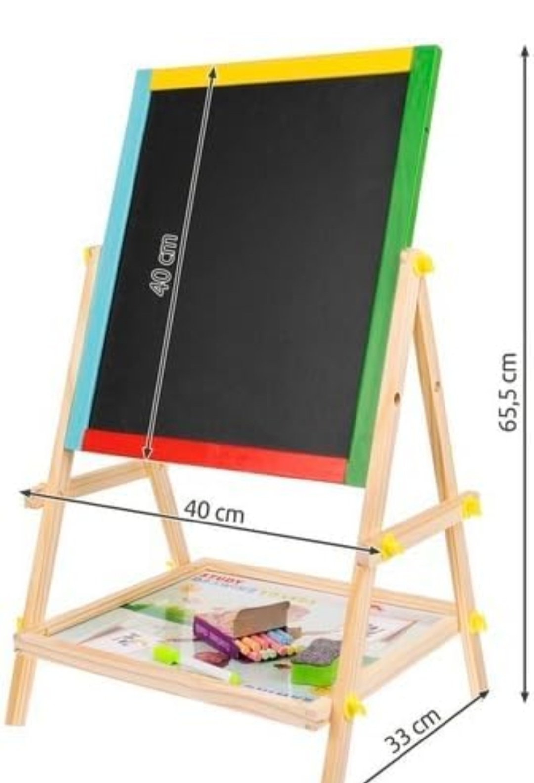 PACKAGE CONTENT: 1 easel board with 1 black board and 1 white board, magnetic alphabets & numbers, chalks and duster.