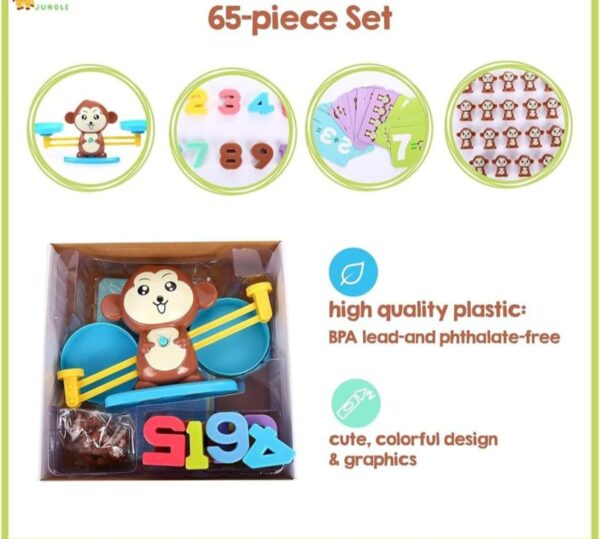 - KID + FAMILY FUN: This 65-piece toy set includes: 19 monkeys, numbers 1–10, 30 double-sided cards, monkey scale, base, 2 scale pans and an easy-to-read instruction leaflet.