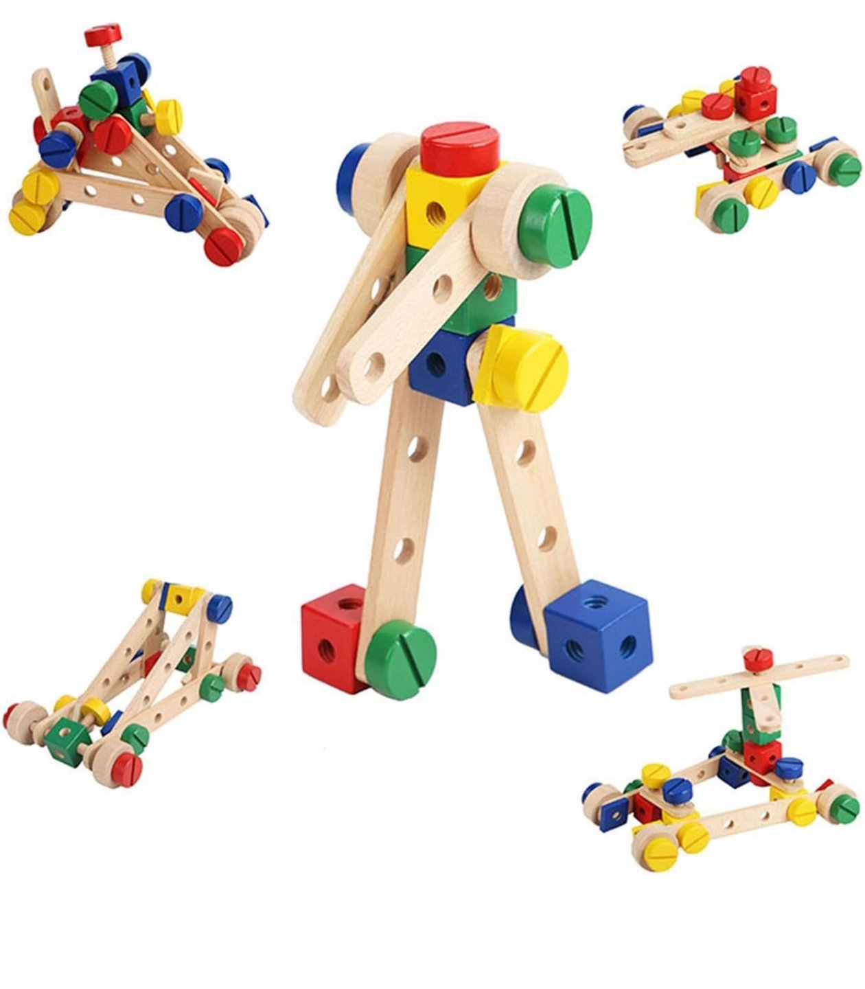 - Montessori Educational‘: This Wooden construction set in vivid colors, Robots, cars, animals, can be assembled in various creative ways
