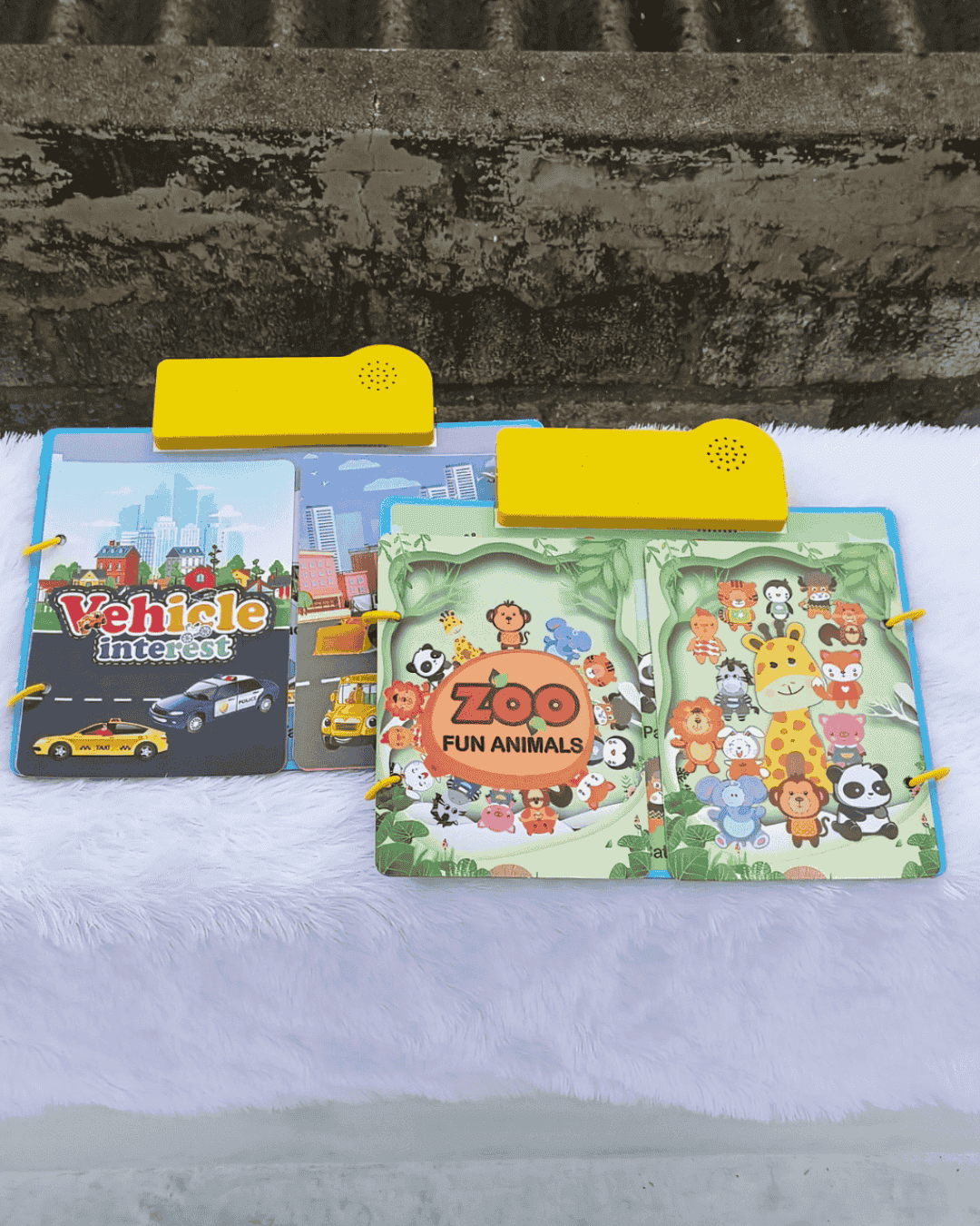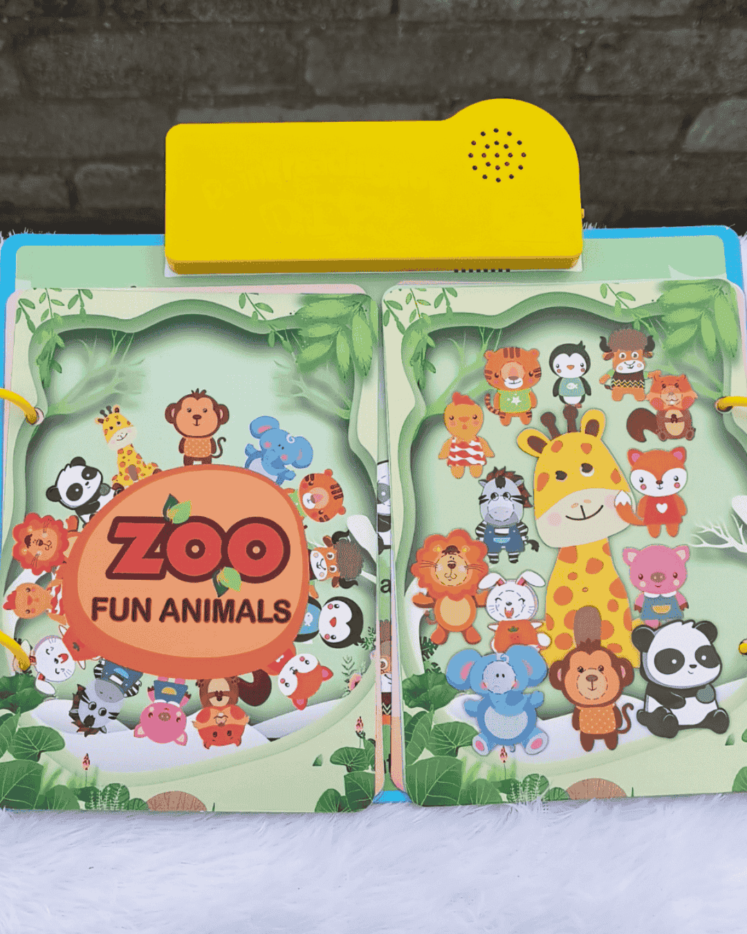 - In the box – 1 X Interactive children book, Use 3 AAA batteries(not include), turn on the switch and click on the corresponding animal to emit animal calls and standard pronunciation words.Animal head sticker can be attached to corresponding animals using velcro