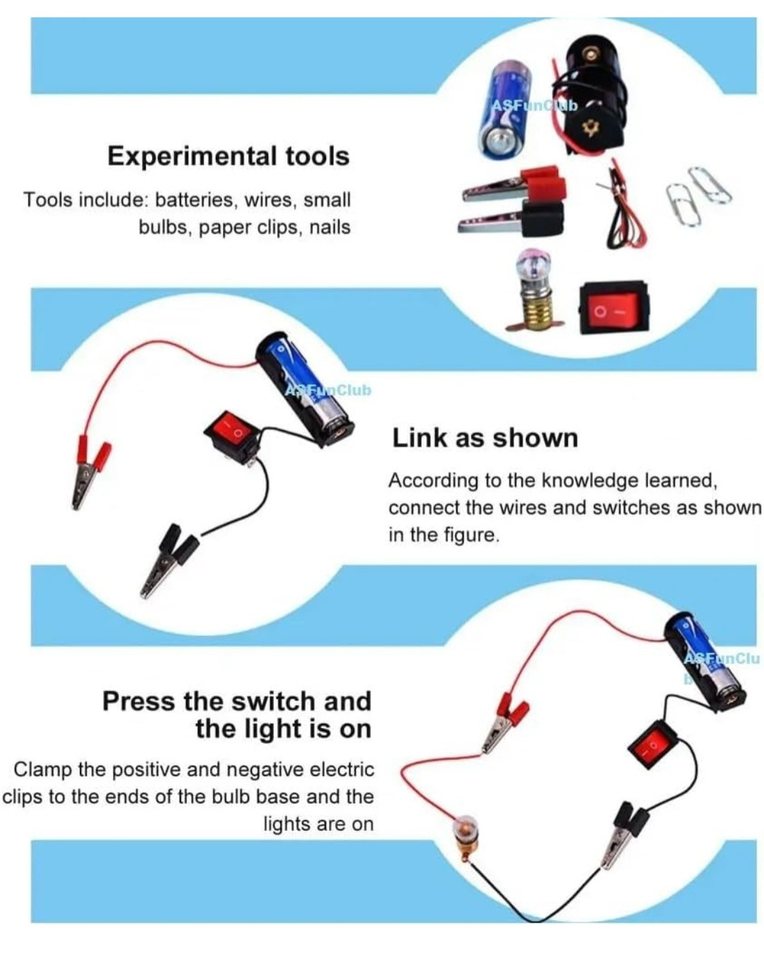 Science Learning Kit – Package includes 1 battery base, 1 air blade, 1 small light bulb, 1 base, 1 battery, 2 alligator clip, 1 switch, 1 10cm line, 1 nail, 1 copper wire, 3 paper clip – Please Note Random Color Will Be Dispatched